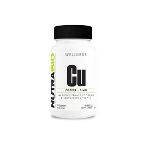 - NutraBio uses Albion Minerals Copper Glycinate Chelate an advanced, more bioavailable and patented form of the essential mineral copper. While most copper supplements aren’t easily absorbed and cause gastric upset, Albion copper is chelated with the amino acid glycine to produce small, organic molecules that pass easily through the digestive tract and are gentler on the digestive system. Copper is important as a cofactor for many enzyme systems (including superoxide dismutase [S.O.D.] and other antioxidants), as a catalyst in the synthesis of hemoglobin, and in collagen formation. Copper also helps in energy production, aids in iron metabolism, and protects nerve fibers.