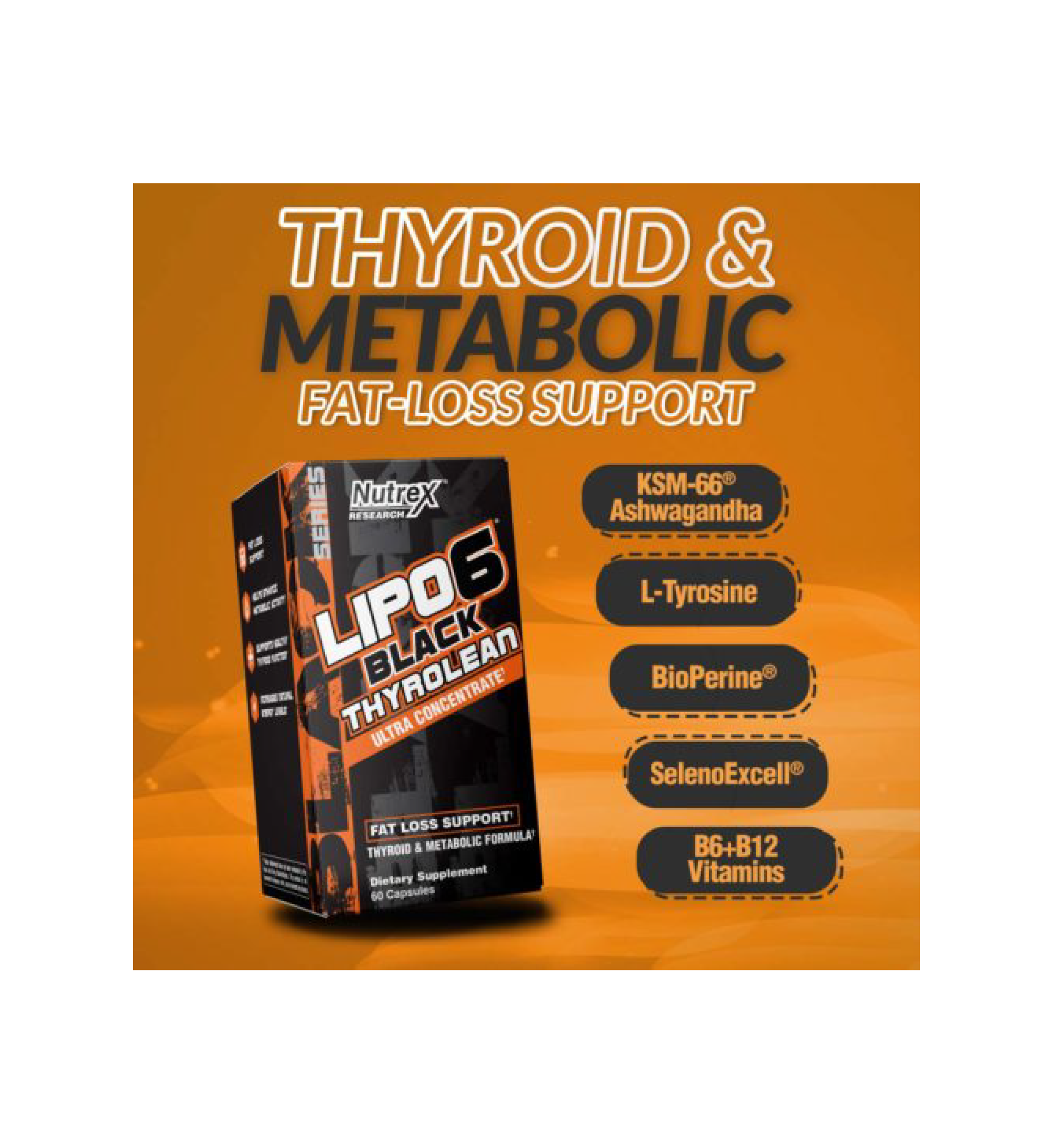 LIPO-6 BLACK THYROLEAN supplies your body with Vitamin B6, B12, Iodine, Selenium, Copper, and Manganese, which in tandem with KSM-66® help support fat loss, enhance metabolic activity, and overall healthy thyroid function.