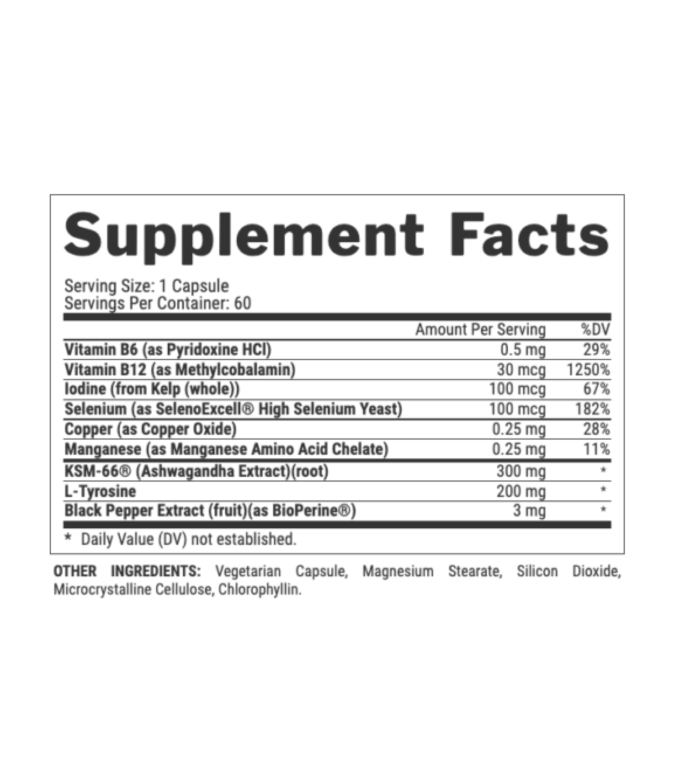 KSM-66®, Vitamin B12, and Iodine from Kelp work synergistically to assist with healthy thyroid function, improved stress adaption, and smooth energy.