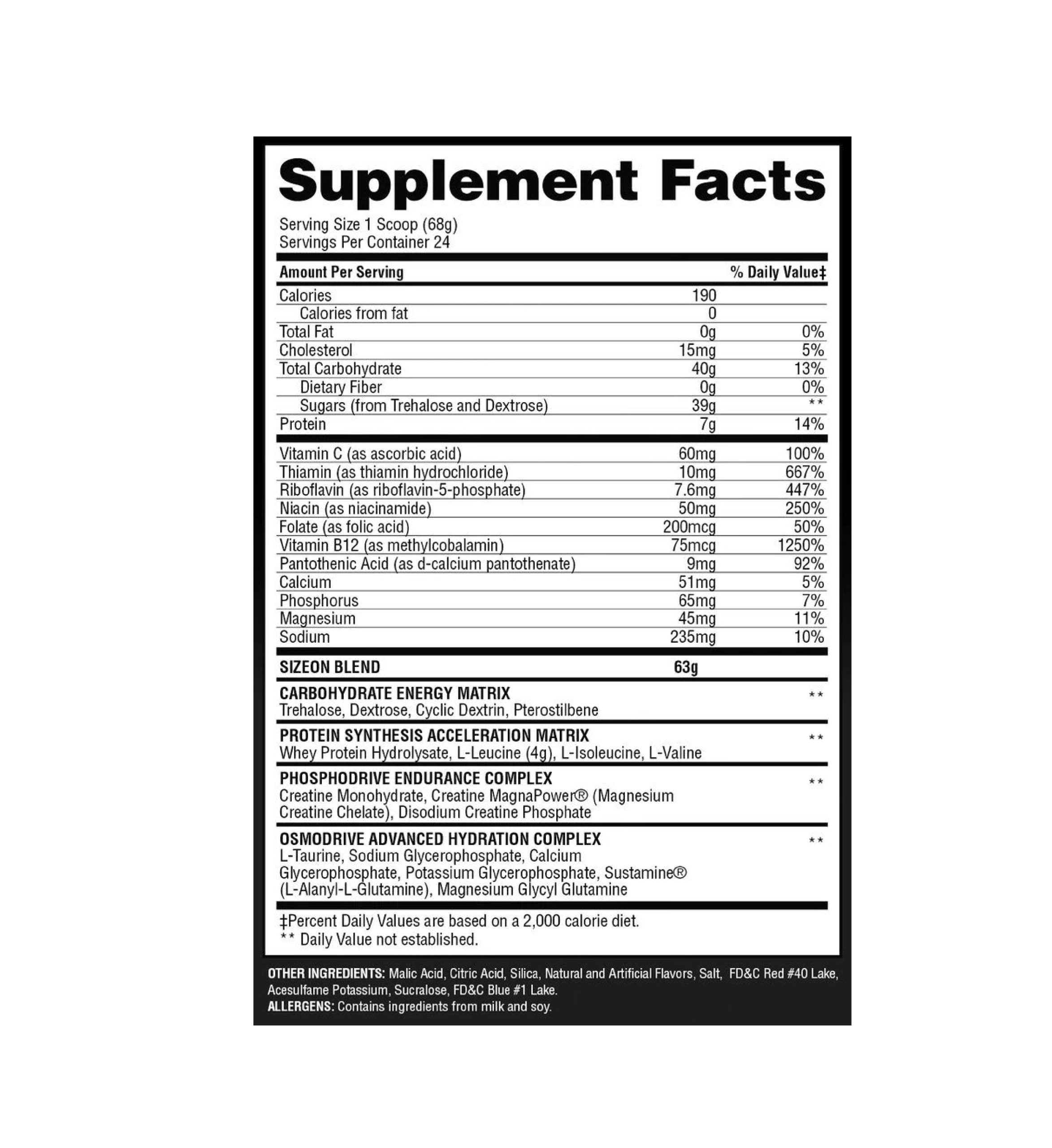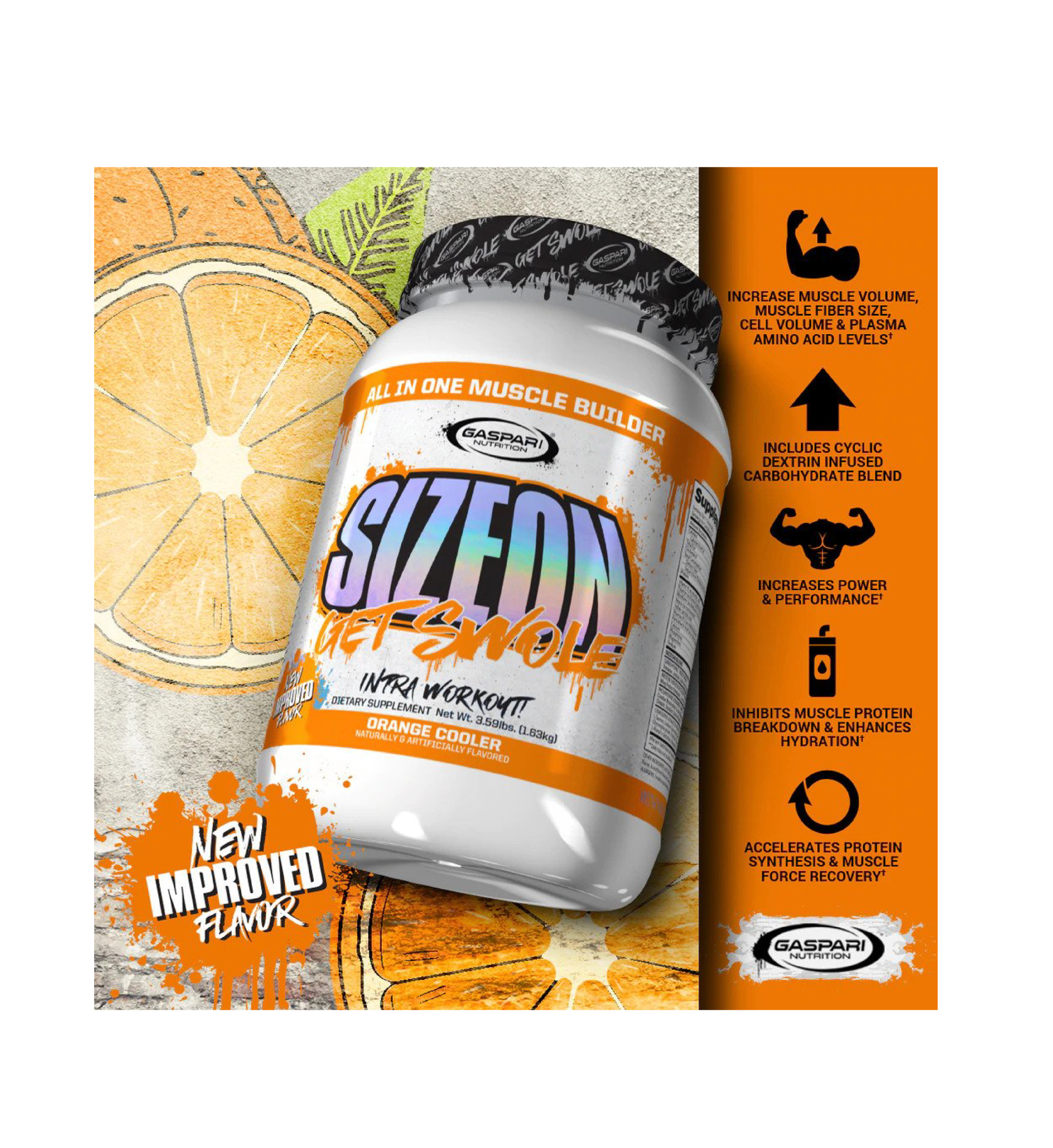Gaspari Nutrition takes sports nutrition to the highest level with SizeOn – The Ultimate Hybrid Intra-Workout Amino Acid & Creatine Formula. The original SizeOn became known as the King of Creatines and by utilizing the latest advances in clinical research, this award-winning formula is better than ever! SizeOn contains high-quality whey protein hydrolysate, which is clinically proven to absorb even faster than free-form amino acids. SizeOn also boasts a premium creatine formula, high-performance carbohydrates, a high dose of L-Leucine (4 g), and many more anabolic-promoting ingredients. SizeOn contains the revolutionary ingredient L-Ornithine-L-aspartate (LOLA), which has been shown to reduce ammonia and improve psychometric function. L-Ornithine-L-aspartate is able to reduce high blood ammonia levels induced either by ammonium chloride or protein ingestion. Furthermore, LOLA decreased protein breakdown and stimulated protein synthesis in muscle.
